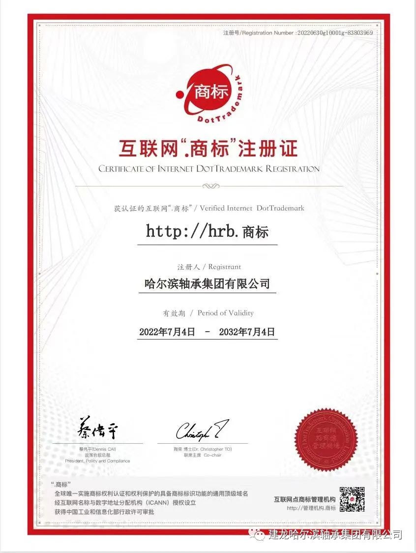 祝賀哈爾濱軸承集團有限公司喜獲互聯(lián)網(wǎng)“商標”注冊證